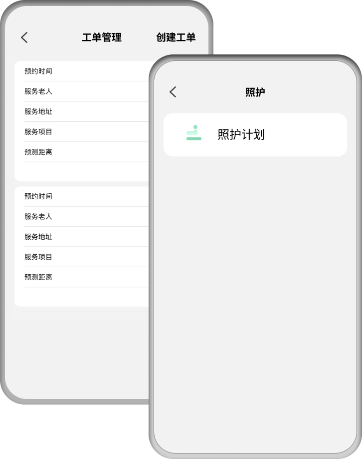 工單管理 機構工作人可在工單管理功能中中,快捷創(chuàng )建工單以及接收工單。 照護計劃 機構工作人可在照護功能中,快捷創(chuàng )建照護的服務(wù)和接收老人的照護訂單。
